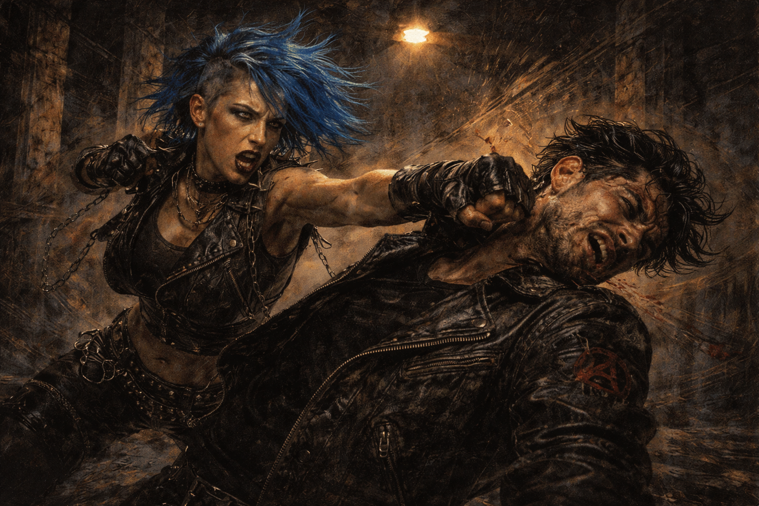 El combo llega al estomago de Lex con seis puntos de dano contundente. No es un golpe — es una declaracion de arquitectura corporal, de lo que puede hacer una Brujah que lleva decadas aprendiendo a destruir cuerpos. Lex siente el impacto en la columna, en la medula, en ese lugar donde el sistema nervioso registra las cosas antes de que el cerebro tenga permiso de procesarlas.