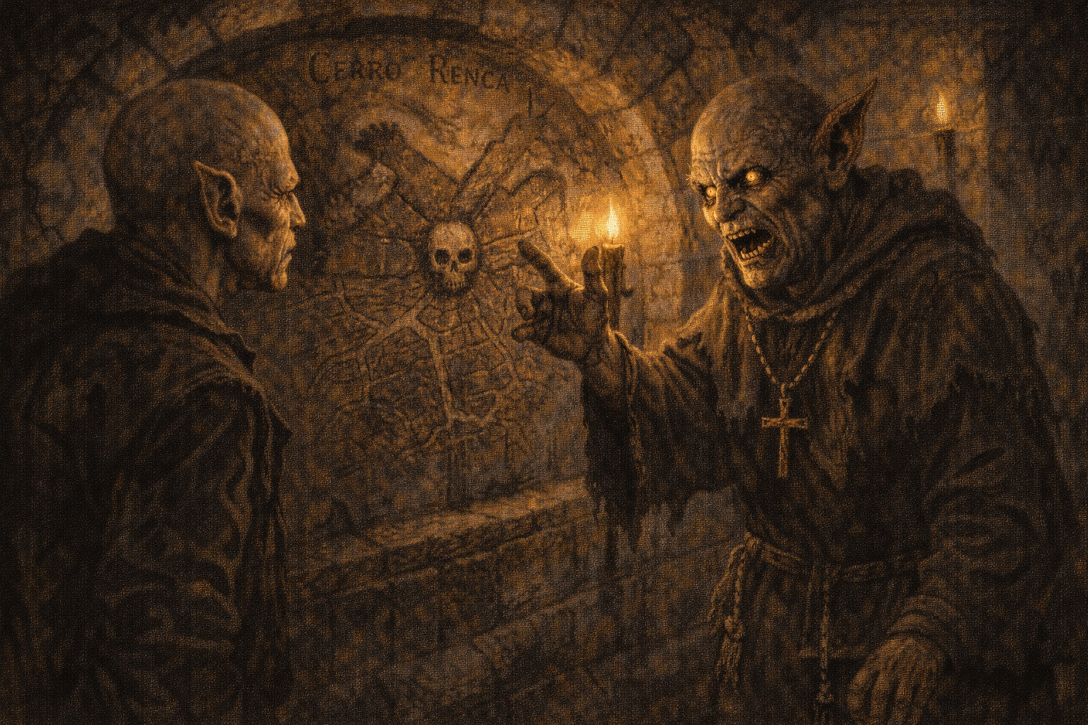 Fray Hernando explica con la precision de quien ha manejado informacion durante siglos: la Puerta de Huesos es la entrada al primer nivel de las galerias subterraneas. Los Nosferatu son los guardianes de esa informacion — la gestionan como la bolsa de valores gestiona el dinero, segun sus palabras exactas. Dice que tiene sus propios agentes en la zona. Que el otro vampiro que Petyr menciono — el que vivia en el cerro antes — no aparece en ningun informe de su red. Que eso, en si mismo, es informacion.