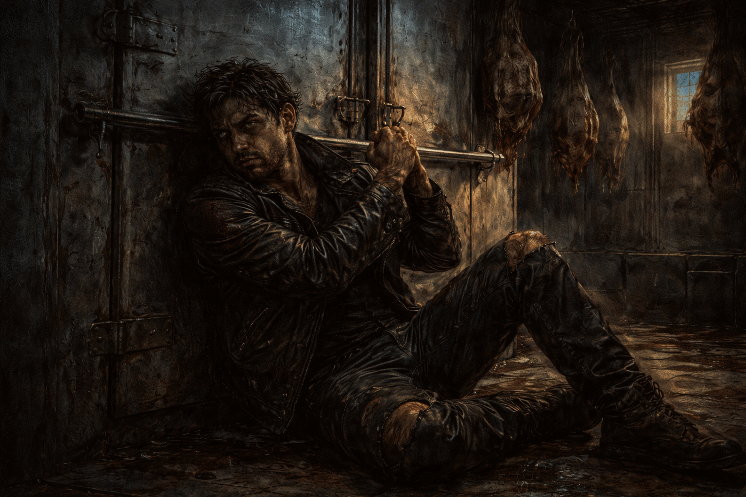 No era una luz amable. Era una franja de oro podrido que se colaba por el hueco de una ventana rota, proyectandose en diagonal sobre el suelo de cemento manchado de sangre seca. La sangre era suya — o mas bien, la sangre era de los dos hombres que habia desgarrado durante el frenesi, y que ahora yacian en pedazos esparcidos entre las reses colgantes, entre los terneros descuartizados que seguian chorreando desde sus ganchos de metal.
