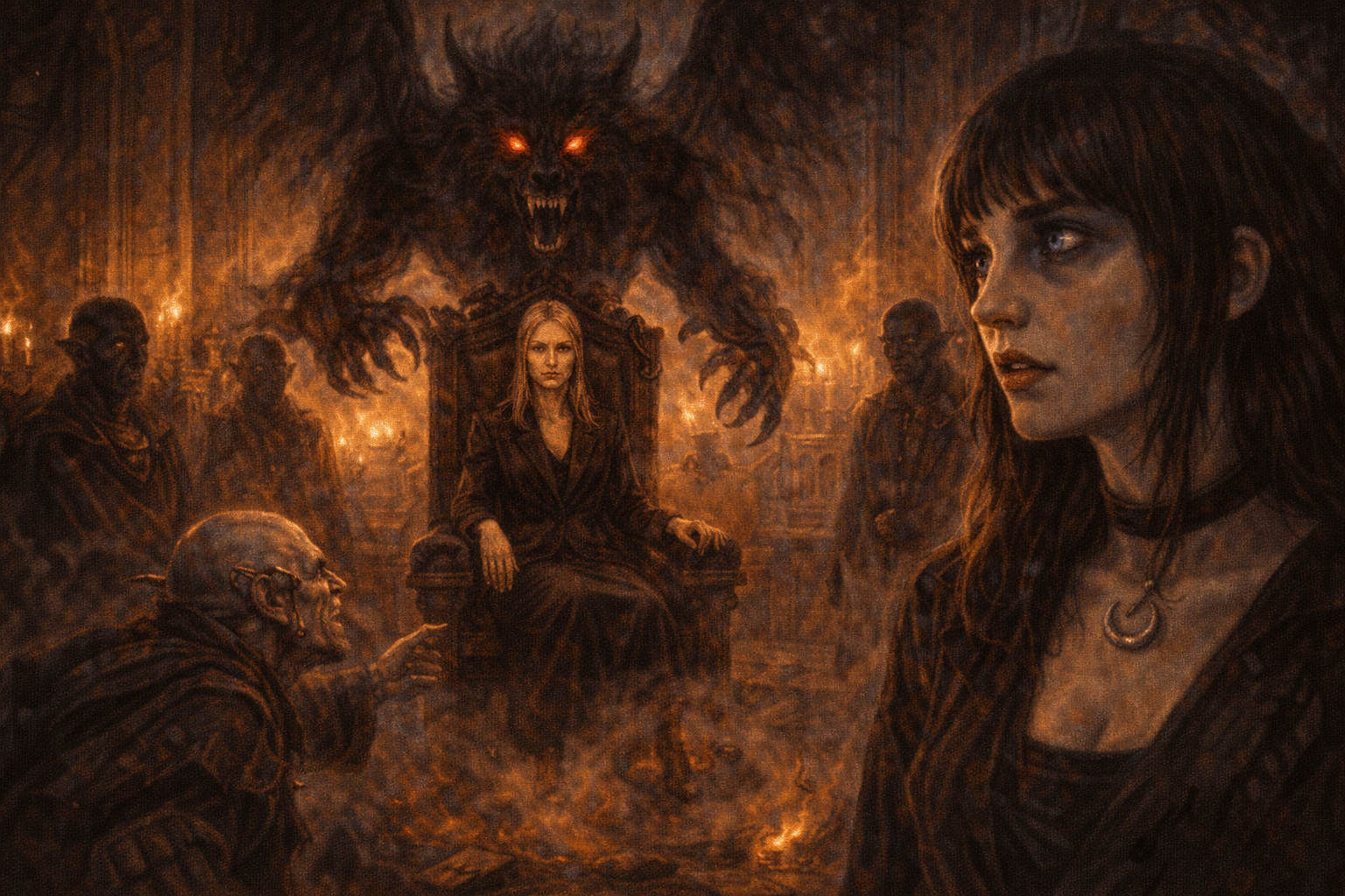 Detras de ella, sobre sus hombros, unas garras se van aferrando lentamente — una por cada lado. Surgen ojos rojos de una bestia sombria que mira fijamente a Lunaria desde detras de la Principe. No es una criatura separada. Es algo que vive dentro de ella, o que la habita, o que ella arrastra como un peso que nadie mas puede ver.