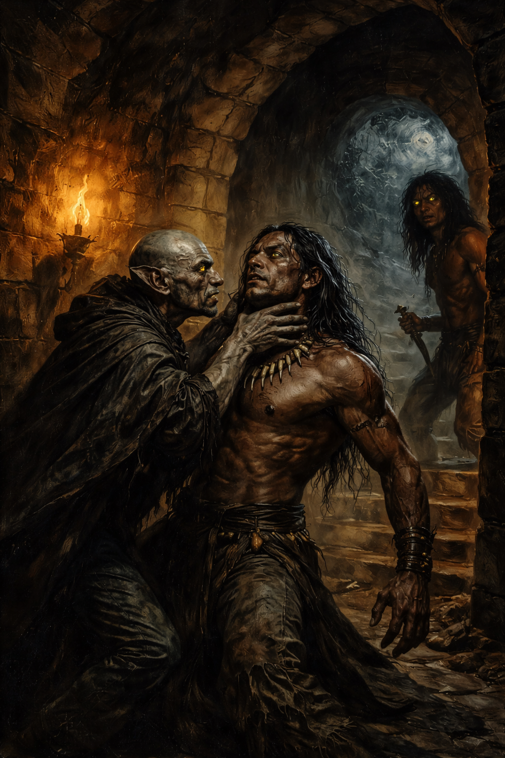 - En ese momento, cuando esta a merced de Petyr, Futapangue se da vuelta con ojos brillantes como los de un gato — la luz se vuelve oscuridad. Muestra colmillos enormes y se lanza a morderle la cara.